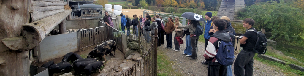 Am ersten Donnerstagmorgen nach den Herbstferien sind wir mit Philosophielehrer Michael Räber auf den Biohof «Zur Chalte Hose» auf den Küsnachter Berg gefahren. Im Philosophieunterricht beschäftigen wir uns gerade mit Tierethik: Dürfen Menschen Tiere halten, nutzen und töten? Auf dem Hof wurden diese theoretischen Fragen plötzlich ganz konkret und greifbar.